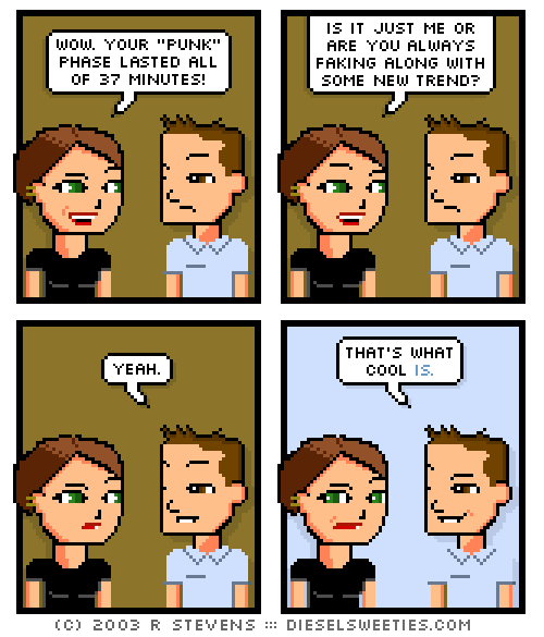 The Daily Dump: Thu Sep 26 17:21:23 PDT 2002 Ok, ok ... ignore the previous entry. NSync really doesn't deserve any kind of respect, period. Though, for a while I thought I was onto something there. From now on I will stick to critiquing the things I know and love, or the things I love to hate ... IDM, DnB, Emo, Garage Rock (NeoDefArt as some people like to call it), Cerebro-Hiphop, Indie Pop ... basically all the requisite music-nerd hipster stuff. Not that I would ever claim to be one or anything! I'm more of a cultural observer, a dabbler at best. I'm like Girl in Cat and Girl. I'm into the idea of a counter-culture because it keeps our bones strong and healthy ... a bit like milk. But I can't be a scenester because, well, that would mean I'm like everyone else in the scene. I must always be my own special snowflake. I'm also full of shit ... I love it! |